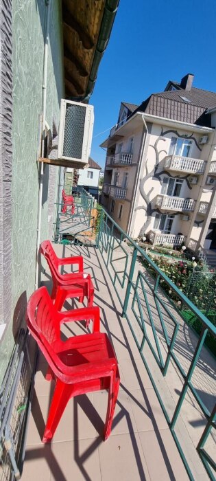 У всех номеров балкон (в некоторых по два балкона), даже на первом этаже. Номера есть на 1-м, 2-м, 3-м этажах.