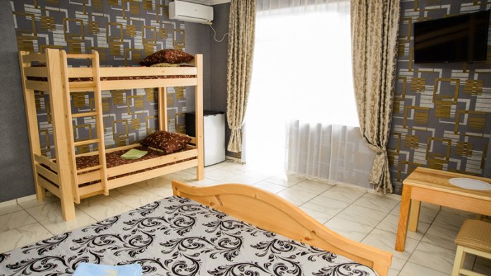Двухкомнатный номер с двумя раздельными комнатами своим душем и санузлом. В каждой комнате небольшой тв и кондиционер. 5 спальных полноценных мест.