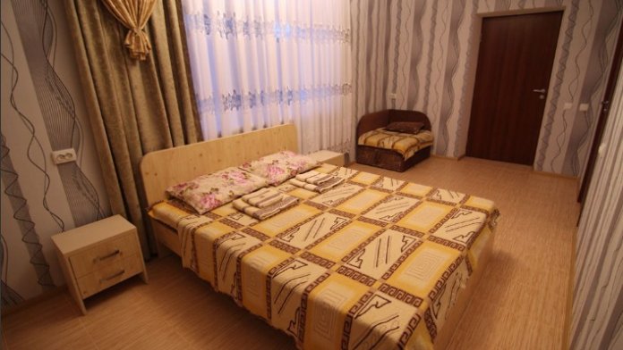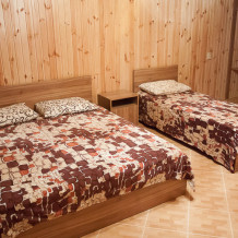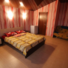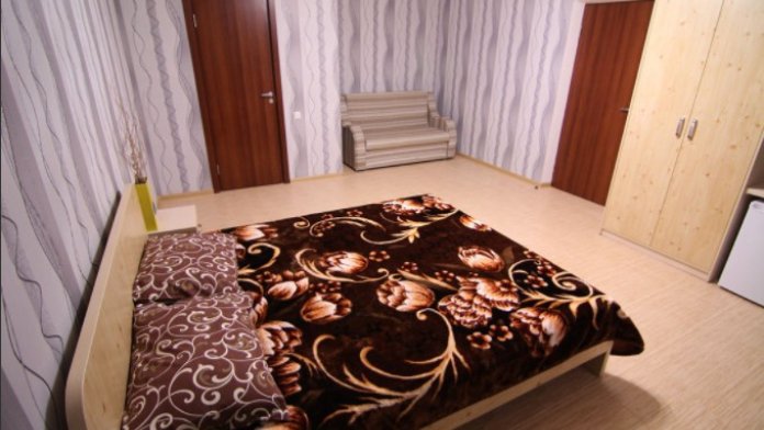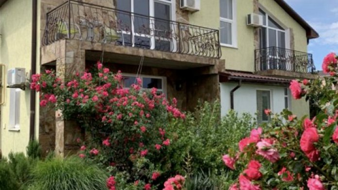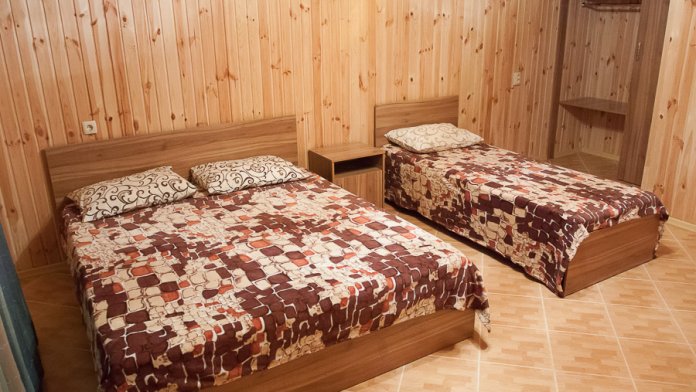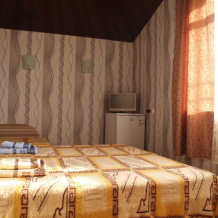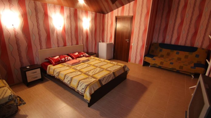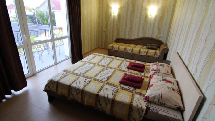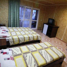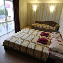 Предоставляем в аренду комфортабельные номера, вместимостью от 2-х до 5-ти человек, с новым современным ремонтом. В номерах все удобства (индивидуальный санузел, постоянно горячая и холодная вода). В каждом номере есть кондиционер, холодильник и телевизор. Wi-Fi. Выход на террасу. На территории есть кухня, беседки, скамейки и мангал. Есть возможность заказать питание. Детская площадка оборудована спортивным инвентарем для детей разного возраста. Есть батут.