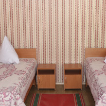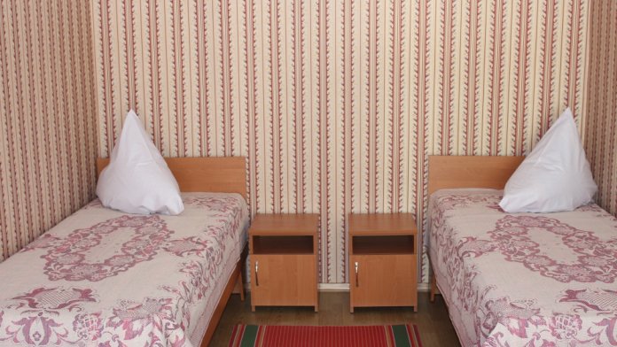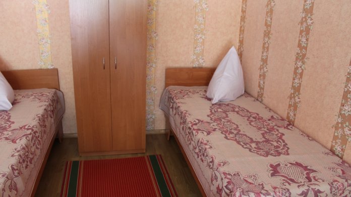Двухместный номер 2 варианта: 1 двухспальная кровать или 2 односпальные кровати. Санузел и душевые общие- во дворе.