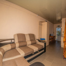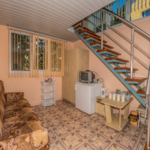 На первом этаже гостиная комната, совмещенная с кухней, и отдельный санузел (душ и туалет); на втором этаже спальная комната с цифровым ТВ, Wi-Fi, кондиционером, двуспальной либо двумя односпальными кроватями, двумя диванами-малютками, прикроватными тумбочками и комодом. В гостиной комнате – раскладной двуспальный диван, варочная панель, электрический чайник, холодильник, микроволновая печь, кухонная мебель со всеми необходимыми кухонными принадлежностями, обеденный стол и стулья. Общий балкон на два номера с видом на горы.
