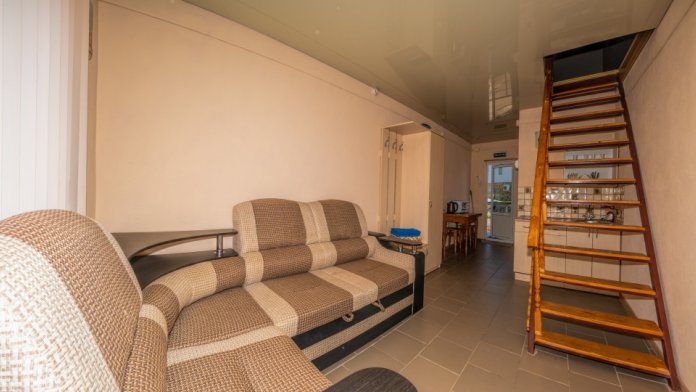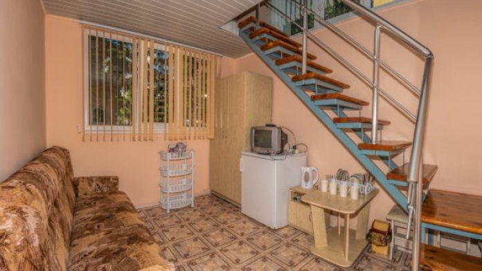 На первом этаже гостиная комната, совмещенная с обеденной зоной, и личный санузел (душ и туалет); на втором этаже спальная комната с кондиционером, Wi-Fi, двуспальной либо тремя односпальными кроватями и прикроватными тумбочками. В гостиной комнате – цифровое ТВ, двуспальный либо односпальный раскладной диван, платяной шкаф, электрический чайник, необходимый набор посуды, холодильник, обеденный стол и табуретки. Общая кухня на три номера. При заселении конфигурация номера может незначительно отличаться (в зависимости от наличия свободного номера).