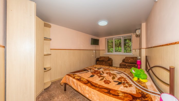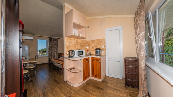 В каждом номере спальная комната, совмещенная с обеденной зоной, и санузел (душ и туалет). Спальная комната оснащена цифровым ТВ, Wi-Fi, кондиционером, двуспальной кроватью либо двуспальным диваном, диваном-малюткой, прикроватными тумбочками и стенкой для одежды. Обеденная зона – мультиваркой, микроволновой печью, электрическим чайником, холодильником, кухонной мебелью с необходимым набором посуды, обеденным столом и стульями. Из окон открывается прекрасный вид на море. При заселении конфигурация номера может незначительно отличаться (в зависимости от наличия свободного номера).