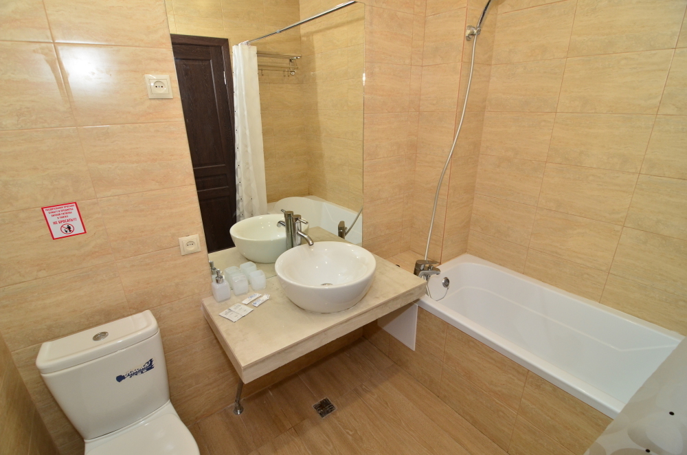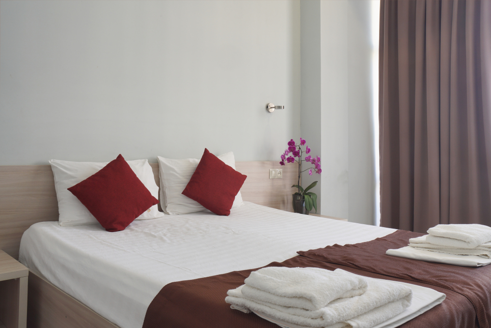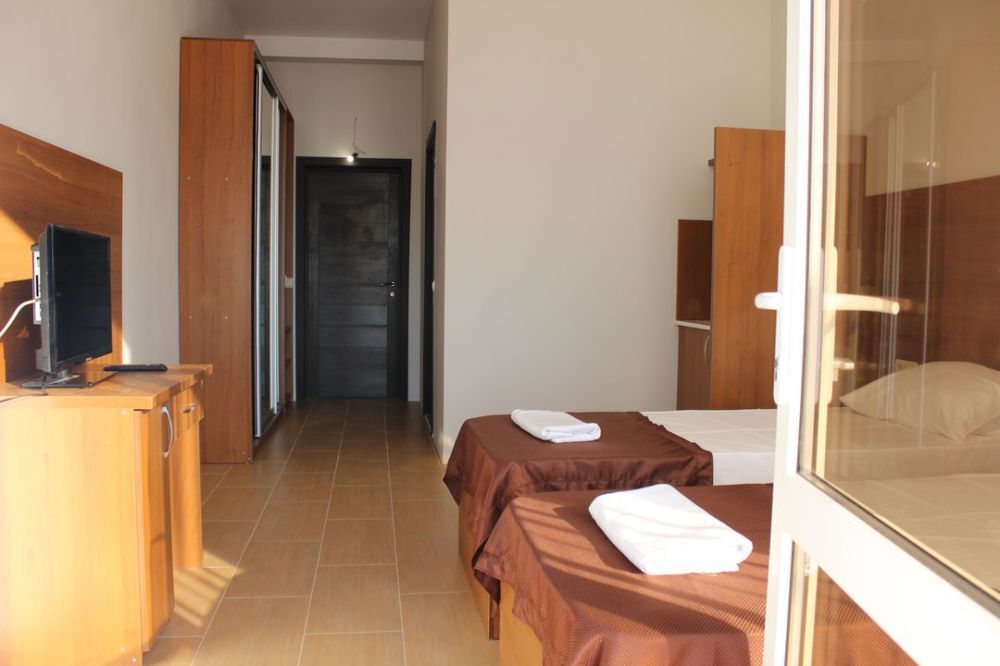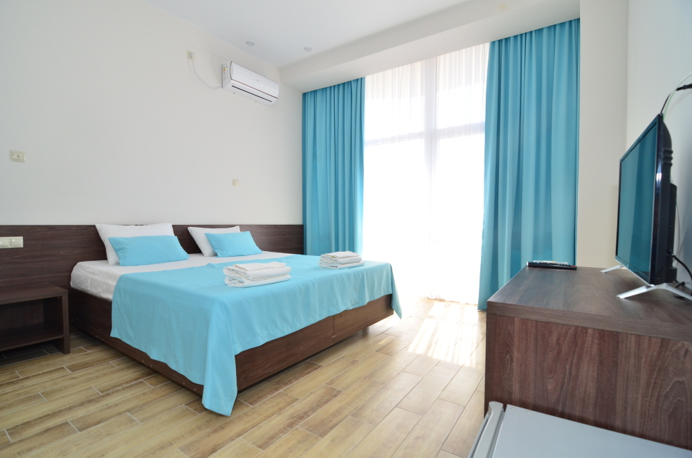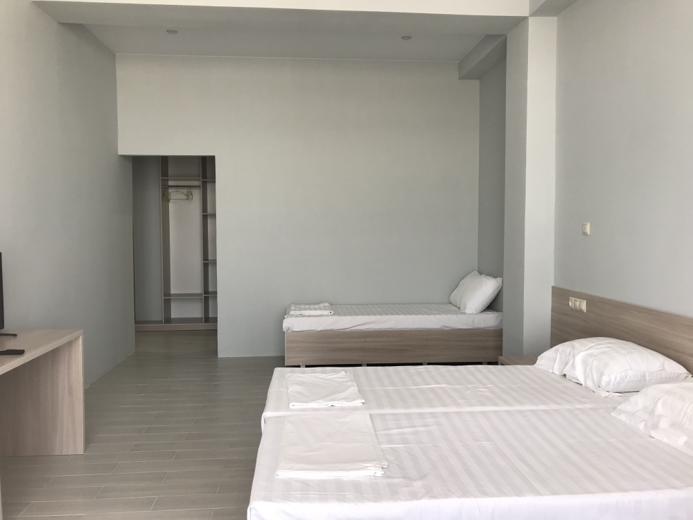 Семейный номер с кухней и балконом. Состоит из спальни (двухспальная кровать и балкон, санузел) и гостинной, где есть обеденная зона и диван раскладной на 2 человек. Также этот номер есть на 1 этаже, там свой дворик, вместо балкона. На кухне индукционная плита одноконфорочная, чайник, набор посуды.