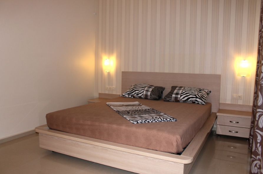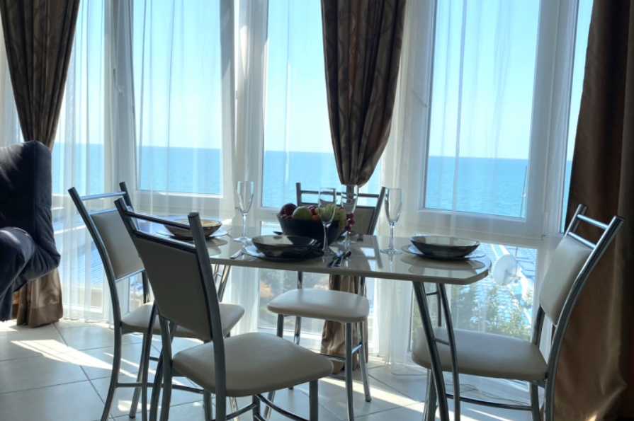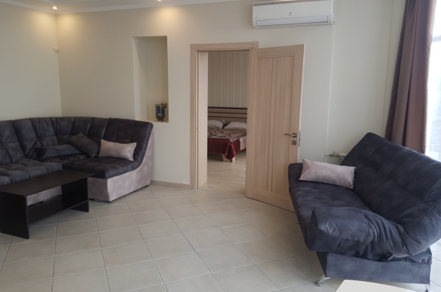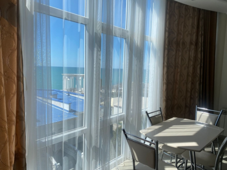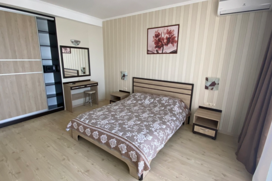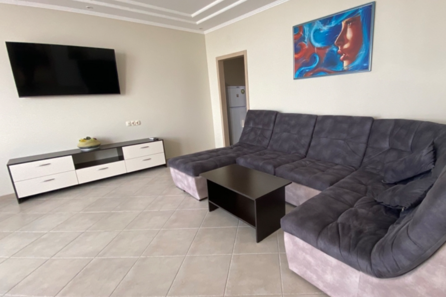 Просторная гостиная с 2-мя мягкими диванами, обеденной зоной и панорамными окнами. Уютная спальня с комфортной кроватью, шкафом купе, сейфом, трюмо и балконом с видом на море. В каждой комнате есть кондиционер и телевизор.