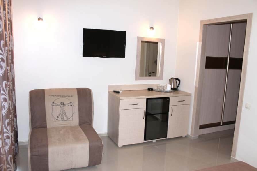 Прихожая оборудована зоной мини-кухни с холодильником, микроволновой печью, эл. чайник, посудой. Просторная ванная комната оборудована выходом на балкон с прекрасным видом на бассейн отеля.