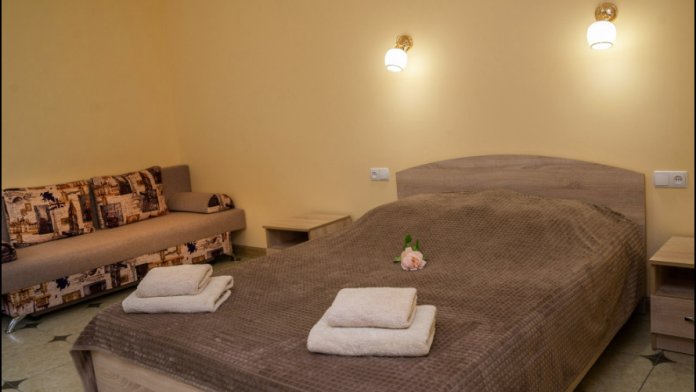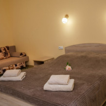 В комнате есть 2-спальная кровать с ортопедическим матрасом, 2-спальный диван, кондиционер, холодильник, телевизор, необходимая мебель для комфортного проживания, санузел и душ.
