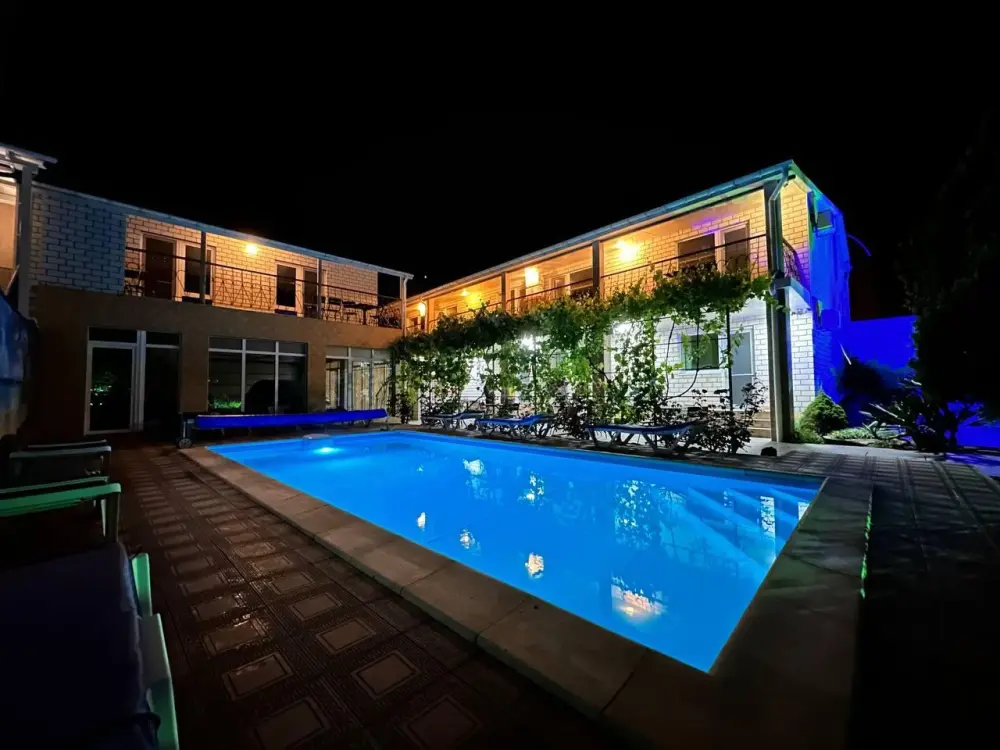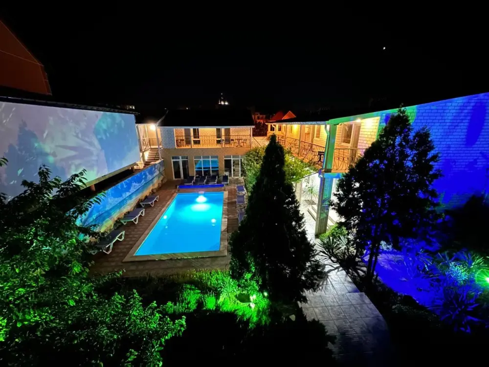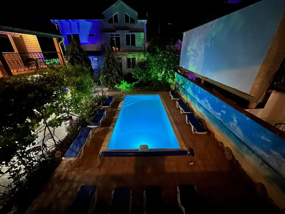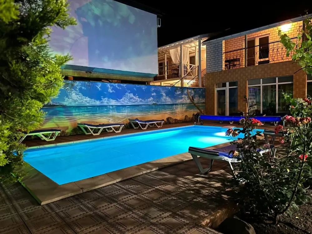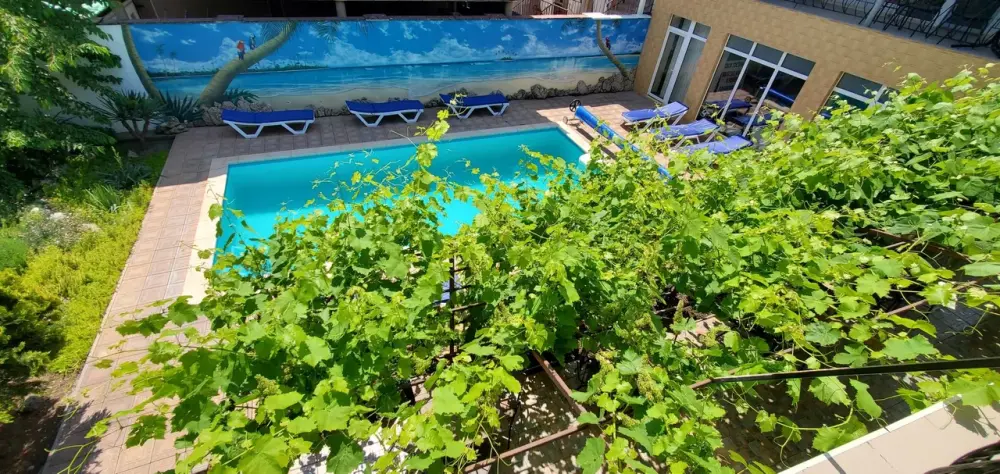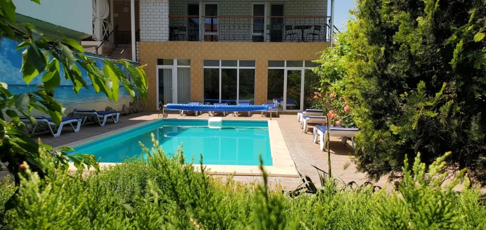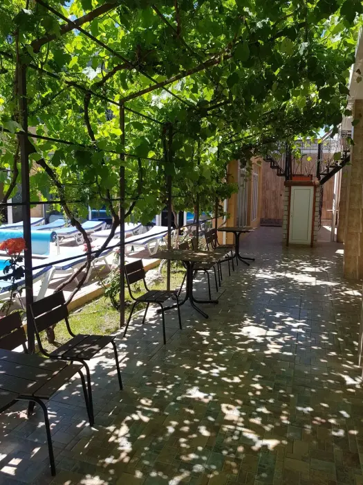 На территории Wi-Fi, плавательный бассейн (с подогревом), шезлонги для загара, в каждом номере кондиционер, до моря 900 метров (7-10 минут ходьбы спокойным шагом), по дороге на море в шаговой доступности столовая, кафе и рестораны, овощной мини-рынок, фирменные магазины крымских вин, детская площадка, вещевой и продуктовый рынки (большой), супермаркет, магазин морепродуктов, на территории видео-наблюдение.