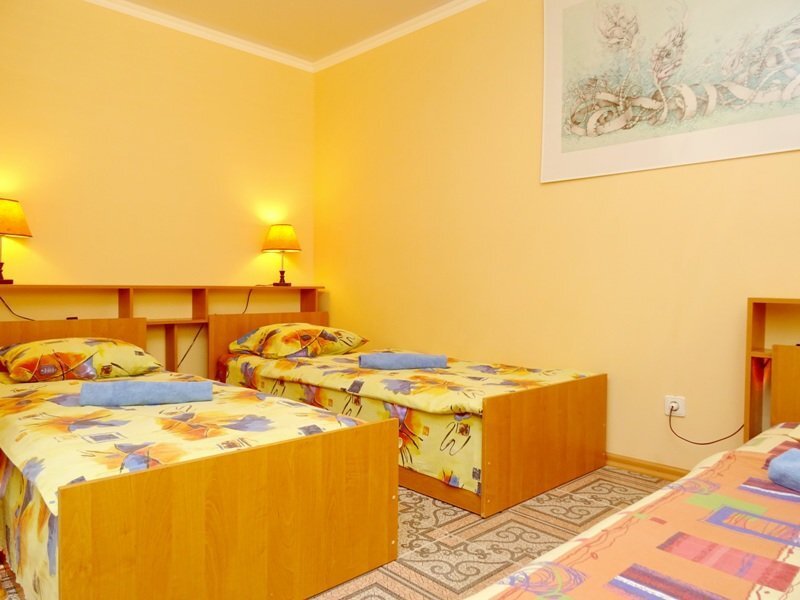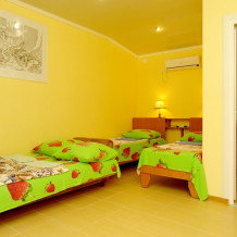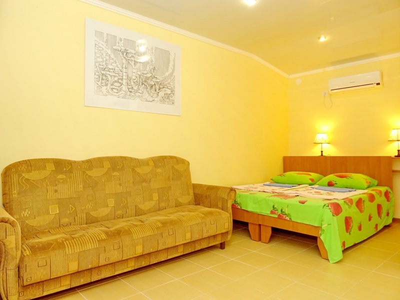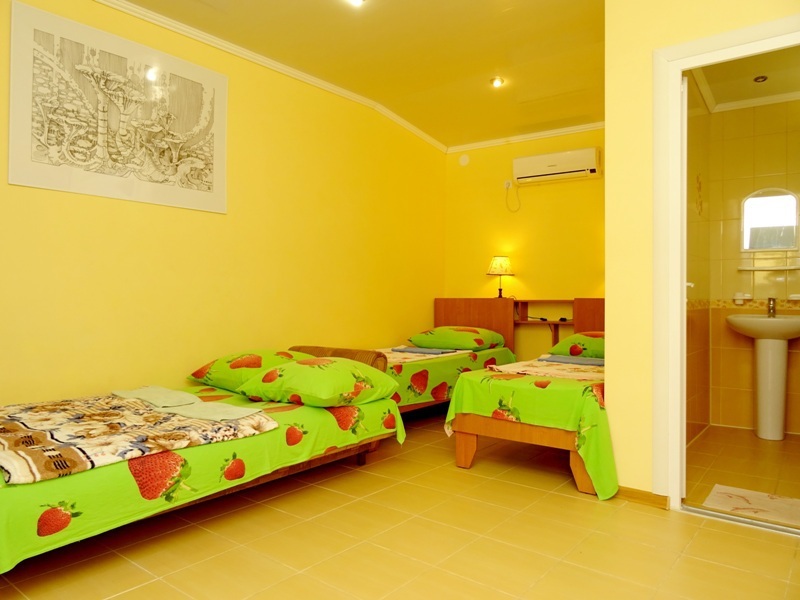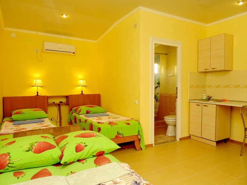 Гостевой дом находится в тихом месте на территории частного домовладения, с забором и видеонаблюдением, стоянка машин вдоль забора с освещением и видеонаблюдением, двор зеленый, вдоль бассейна шезлонги для загара, бассейн с подогревом, в шаговой доступности мини рынок, магазины, кафе, по дороге на море в Комсомольском парке большой детский городок, ближайший пляж песчаный (7-10 минут спокойной ходьбы).