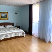 Двухэтажный коттедж - это две спальни, гостиная, два санузла и мини-кухня. В коттедже 4 основных места. В спальнях 2 одноместных кровати и одна двухместная. В гостиной имеется раскладной диван. Жилая площадь позволяет размещение одного дополнительного места. Мини-кухня оборудована микроволновой печью с комплектом посуды, большим холодильником и набором мебели (обеденный стол и стулья).