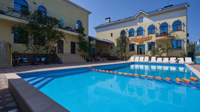 На территории гостевого дома расположены 2 корпуса, 2 летних крытых беседки (чайная зона + кафе и беседка для занятий аниматора с детьми), открытый бассейн с подогревом, гидромассажем и раздельными взрослой и детской чашами, столовая, детская площадка, вечерний кинозал, батут, настольный теннис, открытая парковка под видеонаблюдением перед территорией гостевого дома.