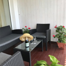 Номер находятся в мансарде здания. В номере просторная гостиная, комфортная спальня, балкон с обеденной мебелью. Видовая терраса с ротанговой мебелью и садовой качелью. В гостиной диван трансформируется в спальное место для двоих гостей. В номере: телевизор, холодильник, кондиционер, шкаф-купе, стол, чайник, посуда, столовые приборы, печь свч, мини-кухня, куллер с водой, санузел, горячая/холодная вода круглосуточно, душ, халаты, тапочки. Отопление: кондиционер, электробатарея. На кроватях ортопедические матрасы.