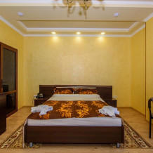 Площадь номера: 18 кв.м. В номере: одна двуспальная кровать, кресло - кровать, стол, стулья, прикроватные тумбочки, шкаф-купе, кондиционер, телефон, зеркало, тумбочка, набор полотенец, набор постельного белья, телевизор, холодильник. В ванной: туалет, раковина, душевая кабина, средства личной гигиены, фен, зеркало.