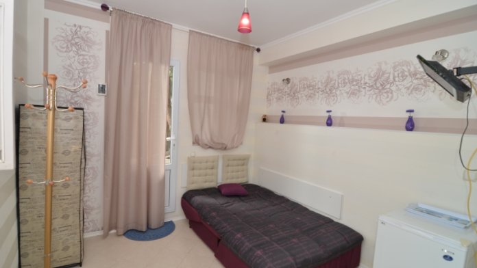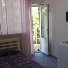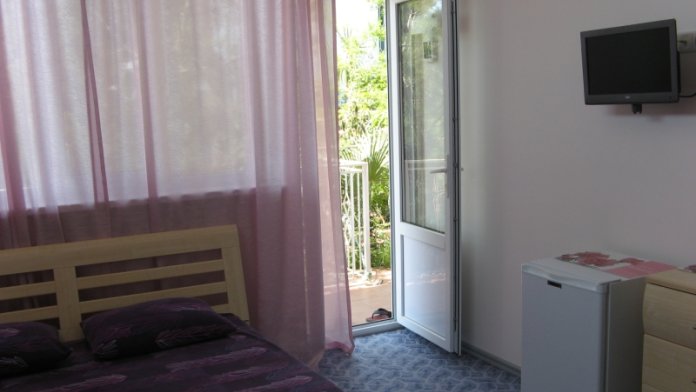Светлый однокомнатный номер с балконом. Он расположен в 3-комнатном отдельно стоящем коттедже на три номера, у каждого номера отдельный вход, дворик с набором летней мебели, видом на море и сад. Оформление в лавандовых тонах настроит на расслабленный комфортный отдых у моря.