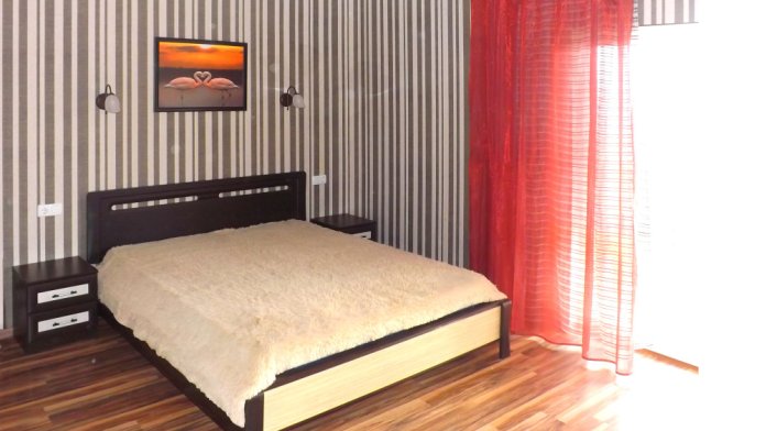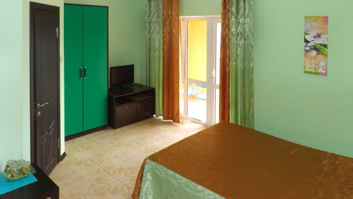 2-х комнатный номер (в каждой комнате санузел), большой балкон+терраса, расположен на 2-м этаже Виллы Васалия. Вид на море. Удобства: две комнаты(в первой комнате большая двухспальная кровать, во второй две односпальные кровати), в каждой комнате собственный санузел (фен в санузле), комплект полотенец, мини-холодильник, кондиционер(в комнате с двухспальной кроватью), цифровое TV в каждой комнате, чайник, большая зона отдыха на балконе(оборудована мебелью из ротанга). Выход на балкон с каждой комнаты. Есть возможность воспользоваться микроволновой печью, плитой, стиральной машиной и утюгом.