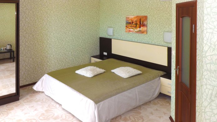 В номере две большие комнаты (в первой комнате двухспальная кровать, во второй две раздельные кровати и раскладной 1.5 спальный диван-кровать), индивидуальный большой балкон (из каждой комнаты есть выход на балкон), расположен на 3-м этаже Виллы Васалия. Панорамный вид на море. Удобства: санузел(фен в санузле), комплект полотенец, мини-холодильник, кондиционер(в комнате с двухспальной кроватью), цифровое TV, чайник, зона отдыха на балконе(стол+стулья). Есть возможность воспользоваться микроволновой печью, плитой, стиральной машиной и утюгом. Стоимость за размещение 5-ти гостей.