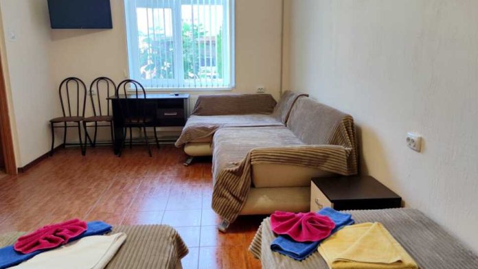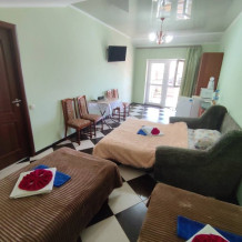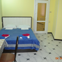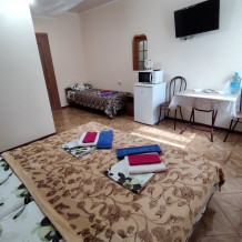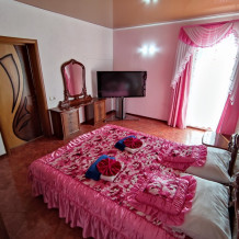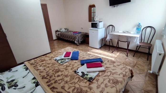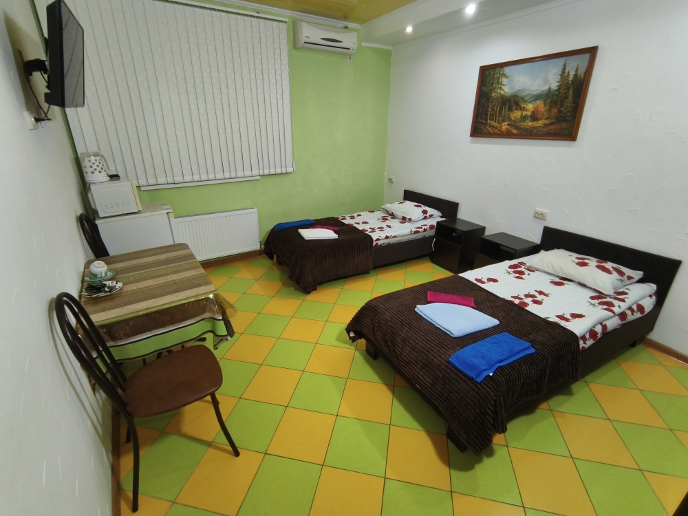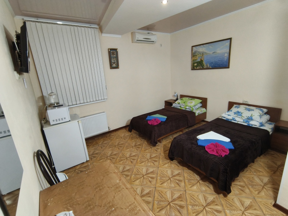 Четырехместный номер 3.2 и 3.5 с двумя односпальными (90 см) кроватями и диваном. Находятся на третьем этаже и выходят на широкую террасу. В номерах есть все, микроволновки, полотенца, шампунь, гель. На этаже на четыре номера есть большая кухня с всем необходимым и стиральной машинкой и огромная смотровая площадка с видами на старый город: Николаевский собор, мечеть Джума-Джами, синагогу, турецкие бани и татарские крыши старинной Евпатории.