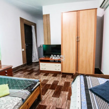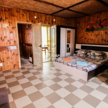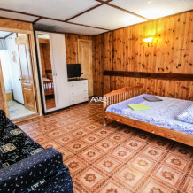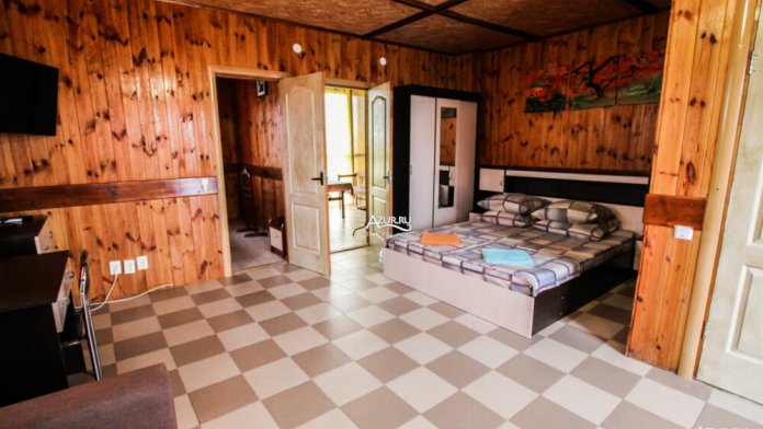 Номер расположен на первом этаже. имеет две смежные комнаты. Сан.узел в номере. Номер имеет свою беседку с обеденной зоной. Интерьер первой комнаты: двуспальная кровать с прикроватными тумбочками, шкаф плательно/бельевой, телевизор ЖК 41d, вешалка с зеркалом и тумба под сумки, холодильник, кондиционер. Вторая комната: две односпальные кровати с прикроватными тумбочками, шкаф плательно/бельевой с зеркалом, телевизор ЖК 35d, стол письменный, стул офисный. Сан.узел: душевая зона со шторой, унитаз, умывальник, держатель для полотенец, фен, зеркало.