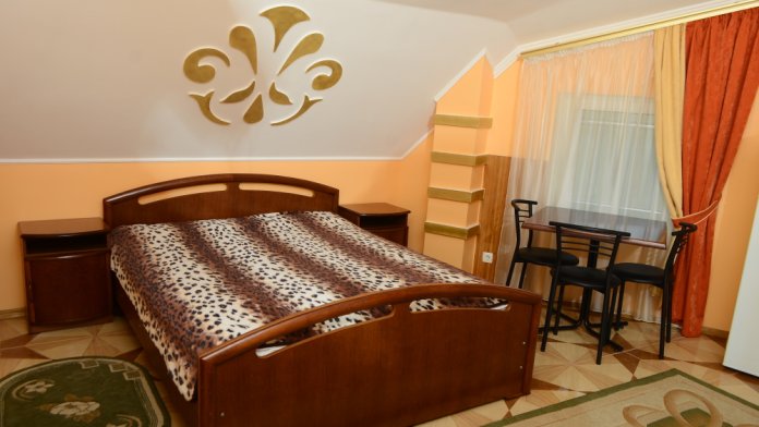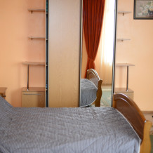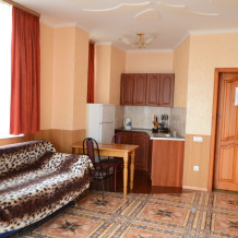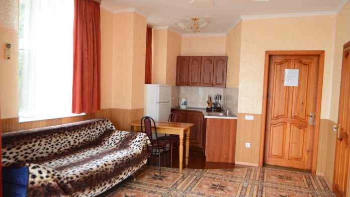 Однокомнатный номер оборудован полноценной кухней, имеются все принадлежности для приготовления. В номере может проживать от 2 до 4 человек. В номере двуспальная кровать и двуспальный диван (комфортабельный). Номер выходит в уютный закрытый дворик, который оборудован столиками и мангалом. В номере чайник, холодильник, санузел. Стиральная машина на несколько номеров.