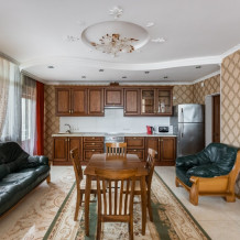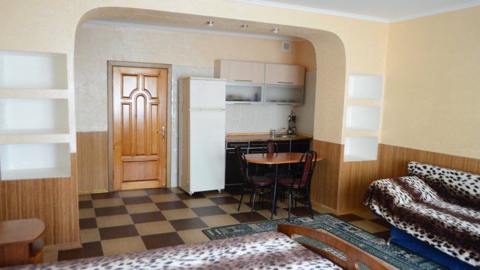 Двухкомнатный номер оборудован полноценной кухней (большая комната-студия), имеются все принадлежности для приготовления. В номере могут проживать от 2 до 4 человек.