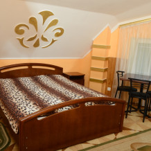 Двухкомнатный номер оборудован полноценной кухней (большая комната-студия), имеются все принадлежности для приготовления. В номере может проживать от 2 до 4 человек. В номере двуспальная кровать и два комфортабельных двуспальных дивана. Номер выходит в уютный закрытый дворик, который оборудован столиками и мангалом. На втором этаже имеется также большая терраса. В номере чайник, холодильник, санузел. Стиральная машина на несколько номеров.