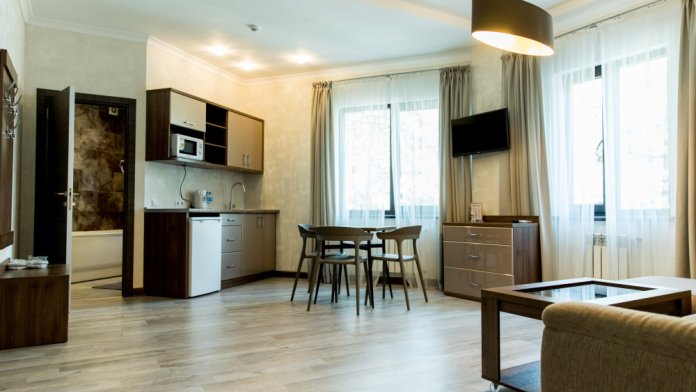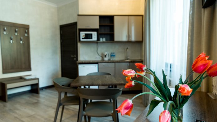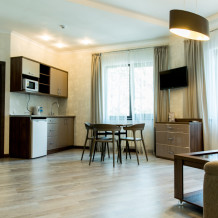 Номер имеет две изолированные комнаты. В каждой кондиционер, телевизор. Красивый дизайнерский ремонт. В номере кухонный уголок, с раковиной для мытья посуды, микроволновкой, холодильником и электрочайником. Минимальный набор посуды, и стол для завтраков на 4 персоны. Фен, гладильная доска, утюг в номере. Сейф с цифровым замком. Из окон открывается вид на гору Ай-Петри.