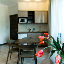 Очень тихий, уютный номер, с кухонным уголком (раковина для мытья посуды, микроволновая печь, холодильник, минимальный набор посуды).