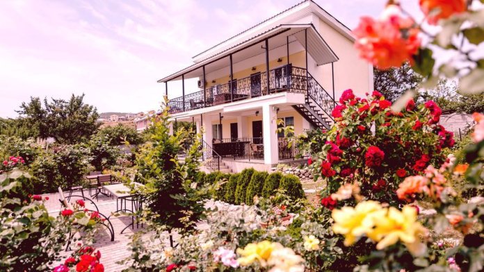 Вокруг домика сад, цветы. Прекрасный вид на горы.
