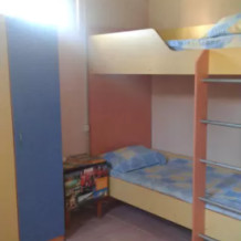 На 3 этаже. Санузел в номере. Кровать широкая 1,6 х1,9 м в спальне, вместительный шкаф, зеркало, тумбочка. В детской комнате спальные места для 3 деток: кресло - кровать 0,9 х 2 м длиной (для взрослого или старшего ребёнка) и кроватки для младших детей 0,75 х 1,6 м - 2 шт. 2 телевизора, в каждой комнате, холодильник, кондиционер, чайник. Горячая вода круглосуточно. Комната находятся в мансарде. Кухня напротив Вашей двери.