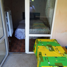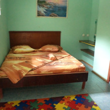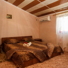 Номер состоит из 2-х комнат с дверью. Одна их комнат проходящая. Кровать широкая 1,8 х 2 м в одной комнате и 2-этажная кровать 0,9 х 2 м для детей в другой комнате. Душевая кабинка, туалет, умывальник. Шкаф, телевизор, холодильник, кондиционер, чайник. Окна завиты виноградом, в комнатах не жарко. Фрукты и овощи можно есть: посажено для Вас дорогие наши Гости.