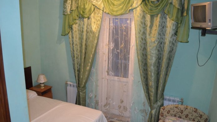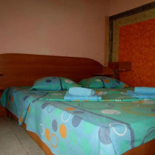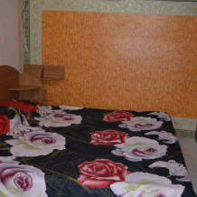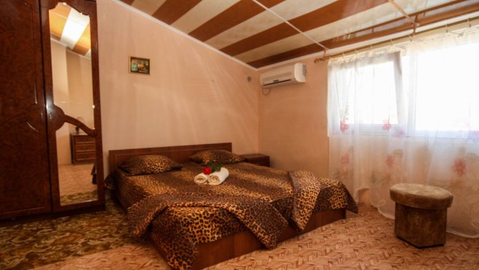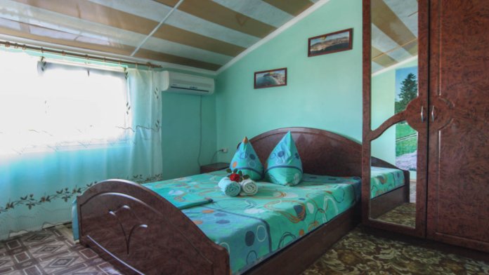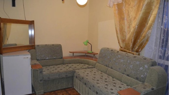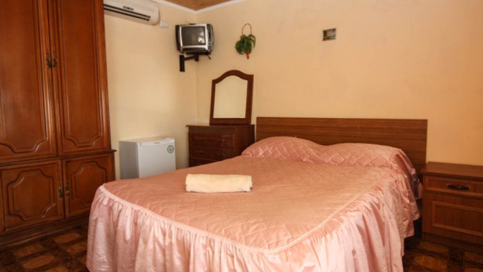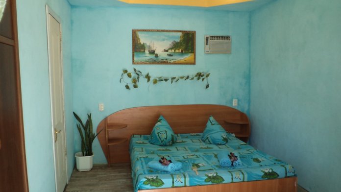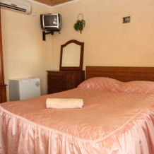 В номере: кровати 1,80 м х 2,00 м и диванчик 1,40 х 1,90, раскладывается вперёд. Шкаф, холодильник, телевизор, кондиционер, тумбочки. Санузел, вода горячая круглосуточно (солнечные батареи). Рядом кухня общего пользования.