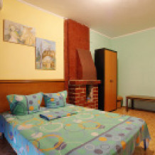 Номер на 3 этаже. Широкая кровать 1,8 м х 1,9 м, диванчик для одного взрослого ребёнка размер 0,8 х 1,9 м и диван 1,4 х 1,9 м раскладывающийся вперёд для 2 взрослых детей. Всего 5 спальных мест. Есть вай-фай. В номере: кондиционер, телевизор, холодильник, чайник, стол, шкаф, тумбочка. Санузел (душ, туалет, умывальник) в номере. Комната находятся в мансарде. Горячая вода круглосуточно. Кухня за стеной.