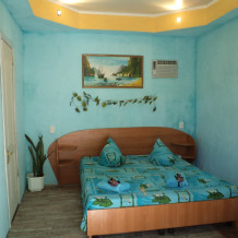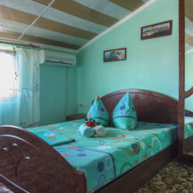 В номере: кровать 1,6 м х 1,9 м, диванчик раскладывающийся вперёд, 1,4 х 2 м, кондиционер, телевизор, холодильник, шкаф, тумбочки, зеркало, прикроватные коврики. Санузел: туалет, душ, умывальник. Находятся на мансарде. Рядом кухня.