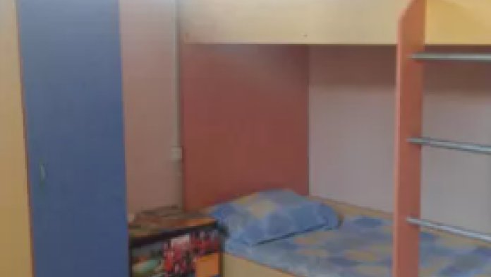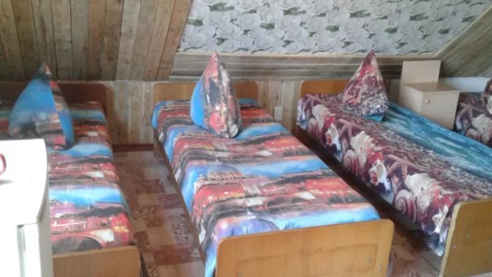 Комната для многодетных семей во дворе, из двух зон отдыха, через арку. Кровать широкая 1,8 м х 2 м и 2 кровати 2-этажные на 4 детских места, детская кроватка до года. Телевизор, холодильник, шкаф, зеркало, тумбочки. При комнатах двор-столовая, со столом и лавками.