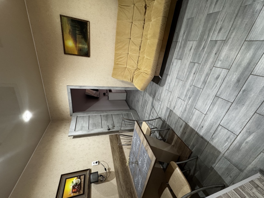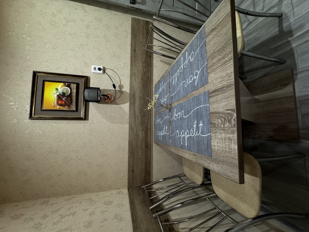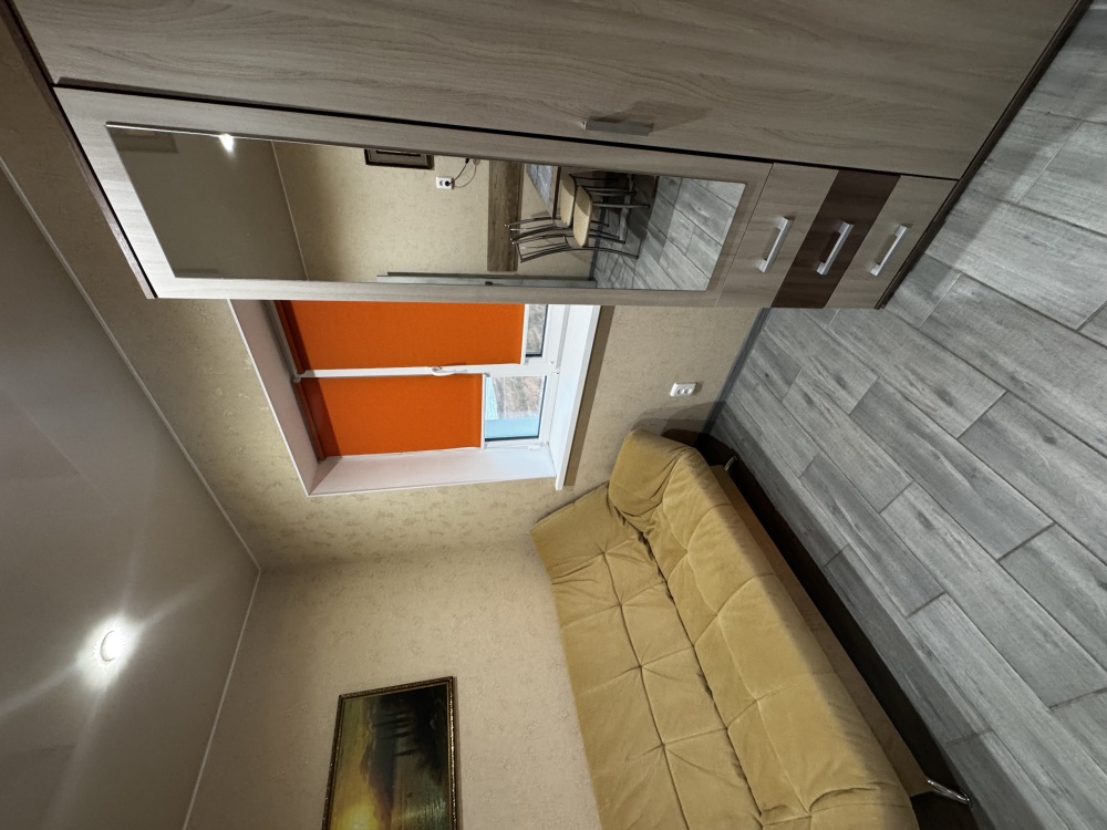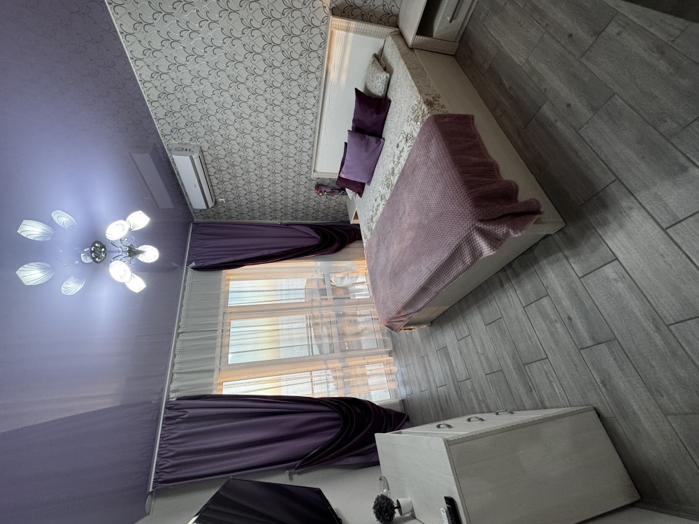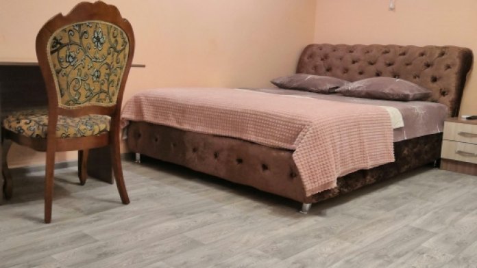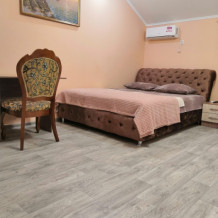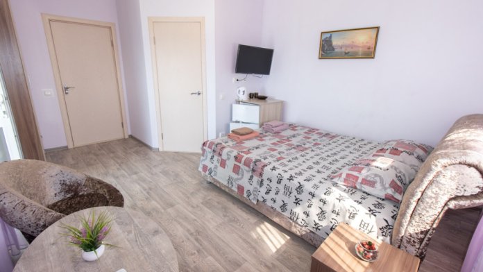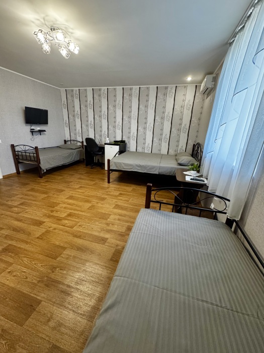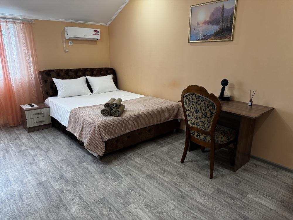 Двухместный номер расположен на третьем этаже,в номере двуспальная кровать с ортопедическим матрасом,два кресла банкетки, журнальный столик,прикроватная тумбочка,шкаф, холодильник, чайник, минимальный набор посуды, телевизор, кондиционер, санузел,балкон(стол, два стула, сушка для белья) .