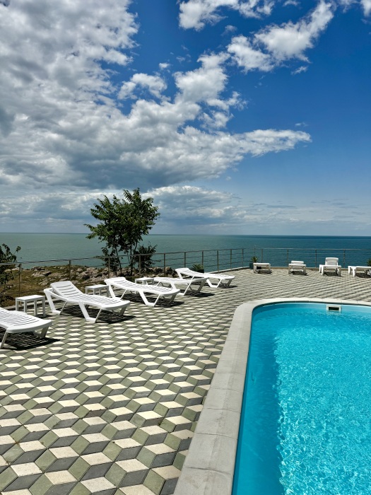 На территории есть крытая площадка для авто,большой озелененный двор,оборудованная всем необходимым кухня для самостоятельного приготовления,зона барбекю,беседка,детская площадка,беседка для детей, бассейн, площадка для отдыха с шезлонгами. Вся территория находится под видео наблюдением.