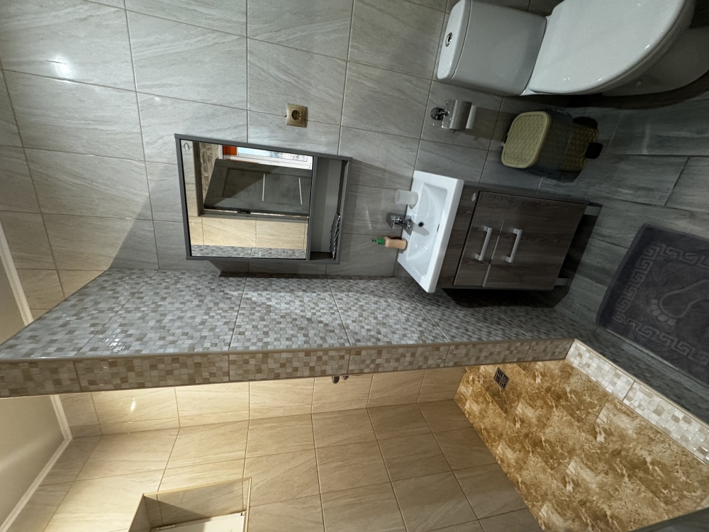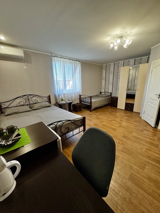 Трёхместный номер расположен на третьем этаже.В номере одна двуспальная кровать, раскладной диванчик,шкаф, журнальный столик, мебельная стенка, холодильник ,кондиционер ,телевизор, санузел.Балкон общий,вид на море и во двор