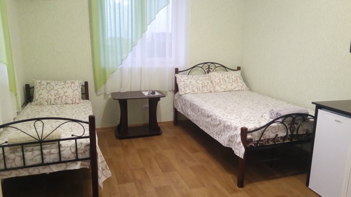 Трёхместный номер вместимостью до трёх человек,в номере полуторная кровать и одна односпальная,шкаф, журнальный столик, холодильник, кондиционер, телевизор, санузел.Номер с балконом, открывается прекрасный вид на море,скалы,сидя за столиком можно проводить красивейшие закаты.