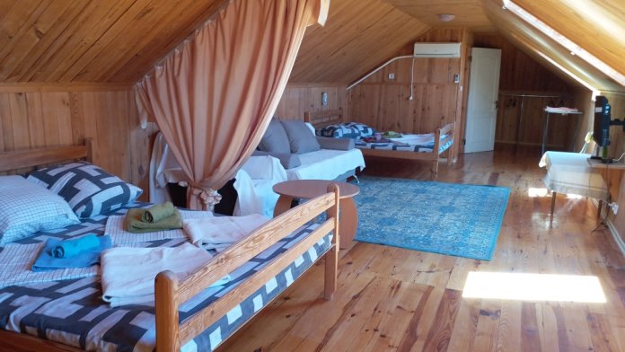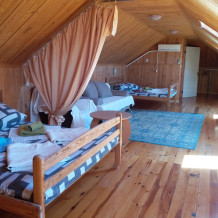 Мансарда отделана вагонкой из сосны, установлены мансардные окна через которые можно видеть море.