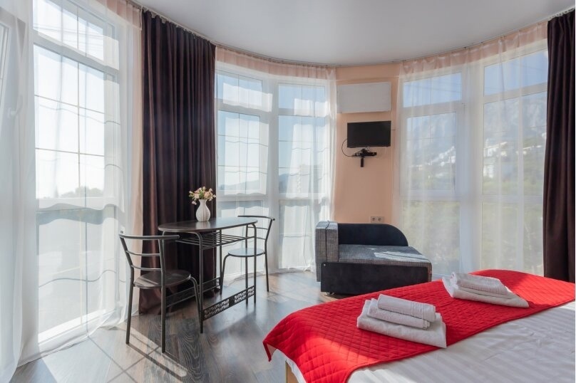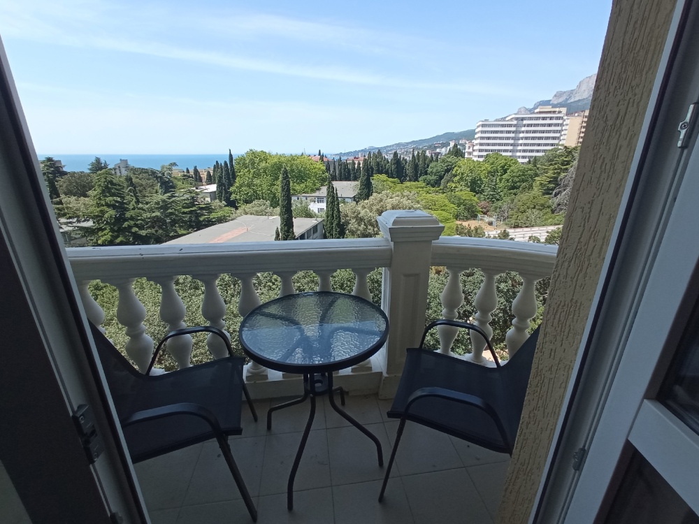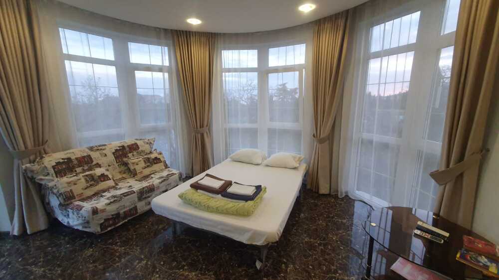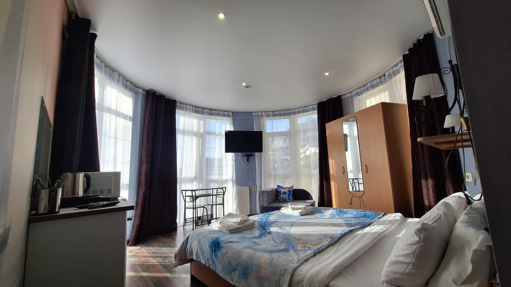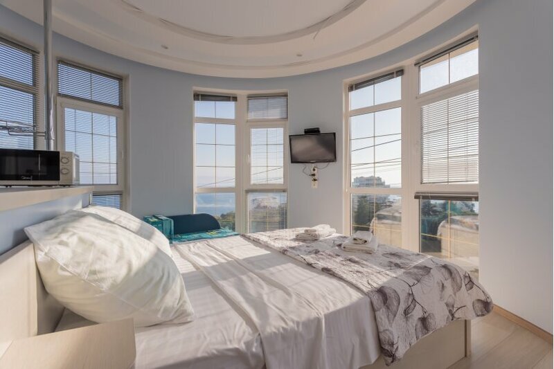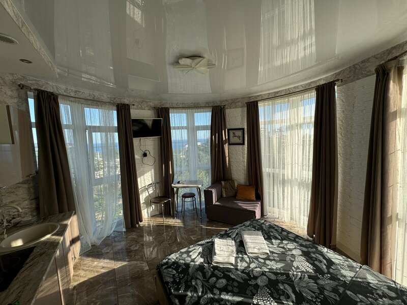 Круглый видовой номер с мини кухней. Из всех окон открывается шикарный вид на море, горы Ай-Петри, ближайшие парки и поселки вплоть до Алупкинской гряды.