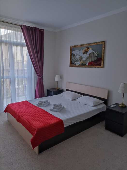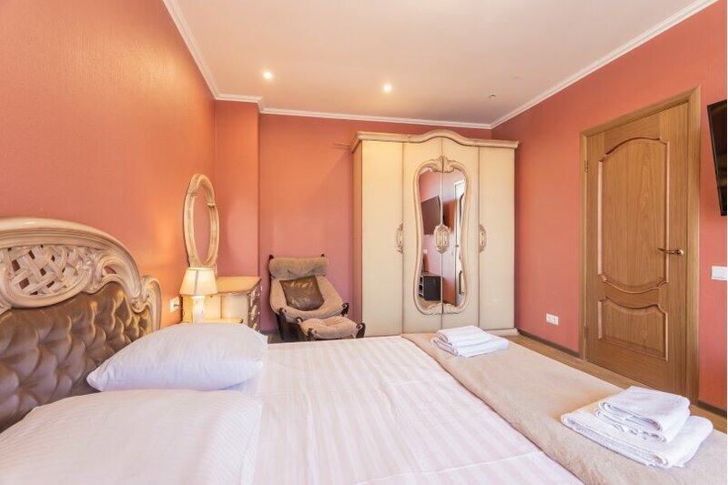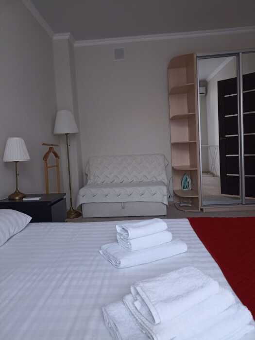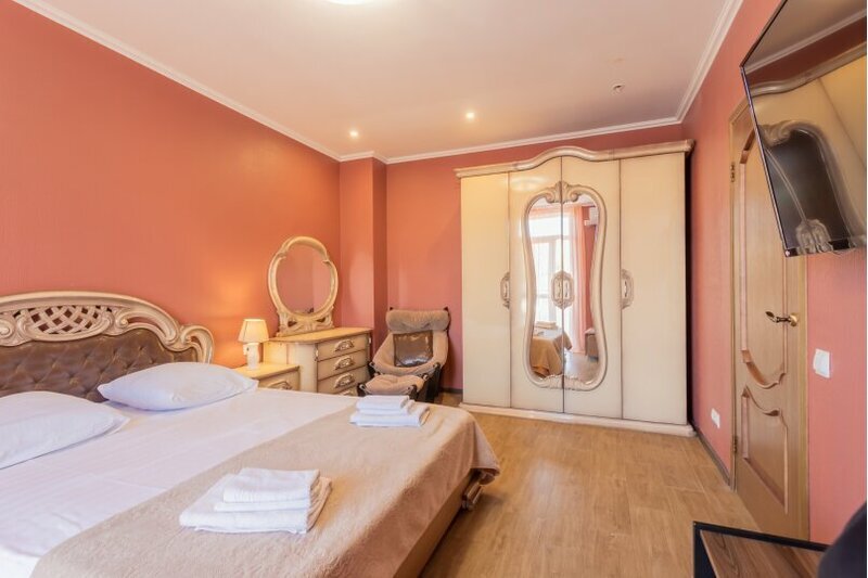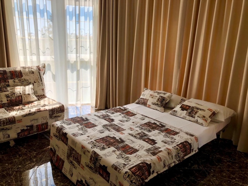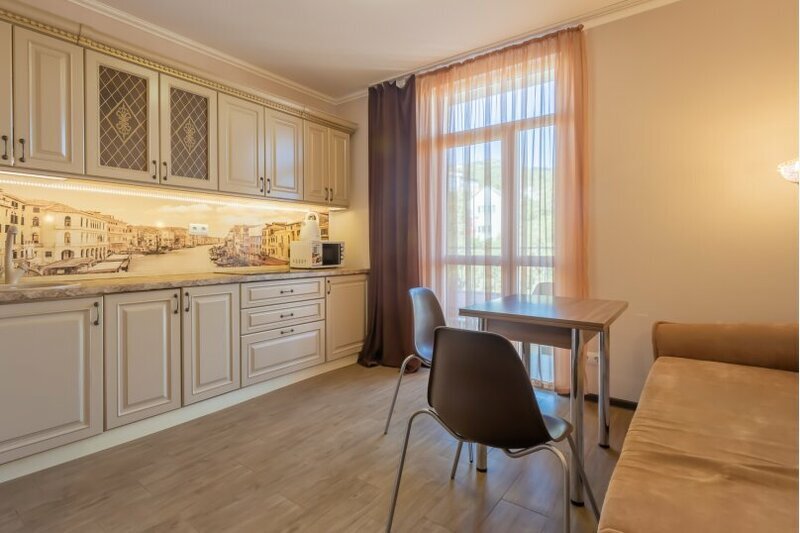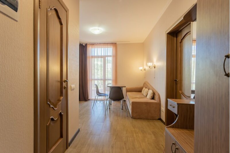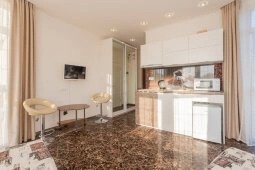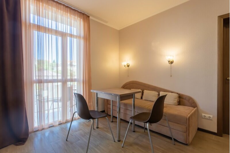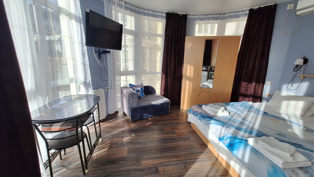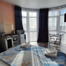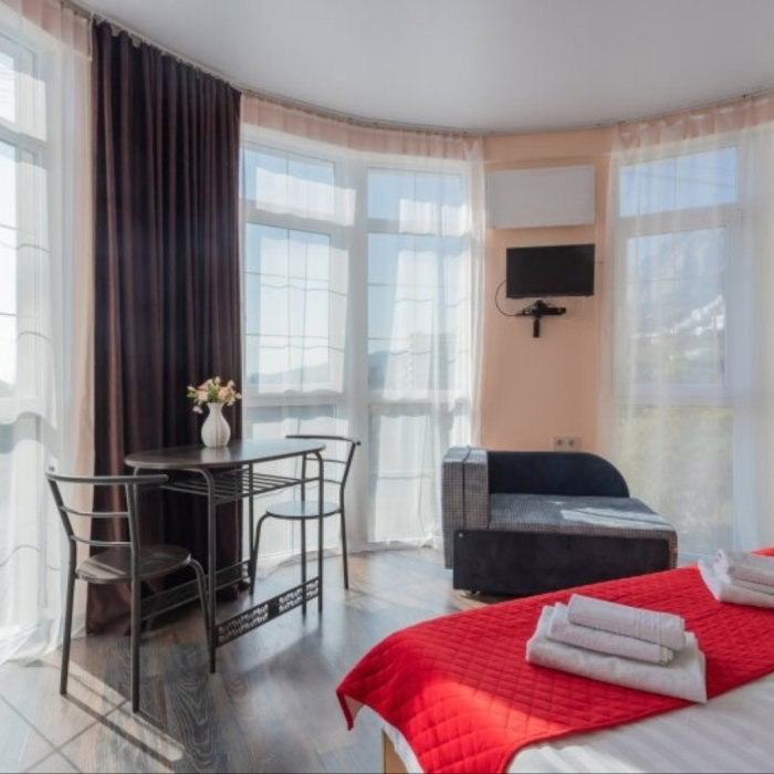 Апартаменты оборудованы полноценной кухней . Спальные места - раскладные евро кровати или диваны. В некоторых номерах - 4 спальных места. Номер также оборудован кондиционером, набором посуды, текстиля, полотенец, стиральной машиной. При овербукинге может быть заменён на круглый-видовой номер.