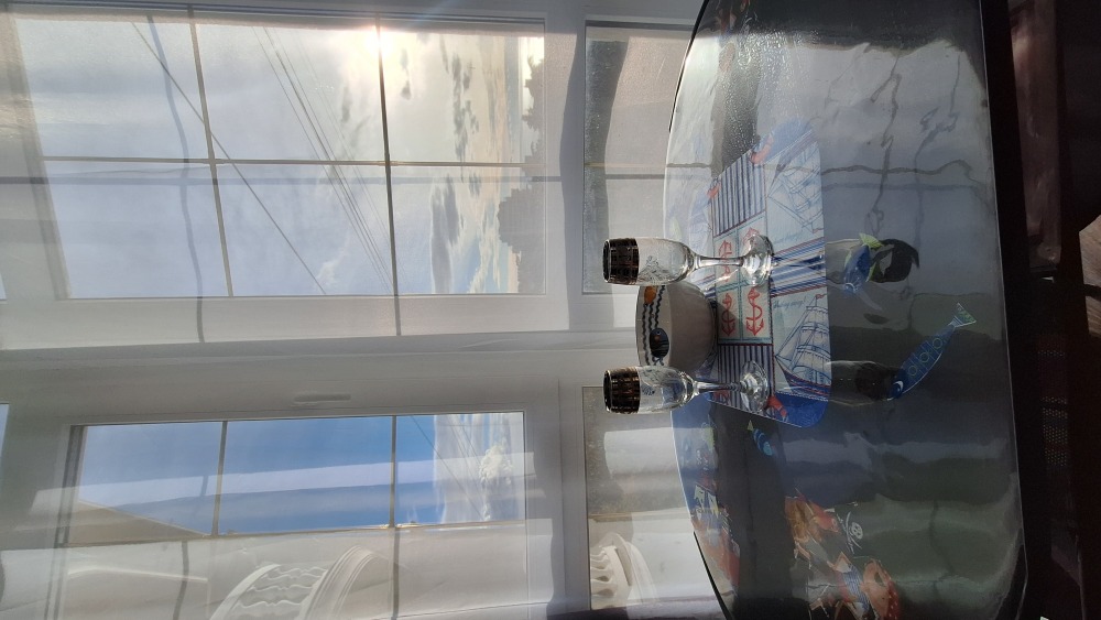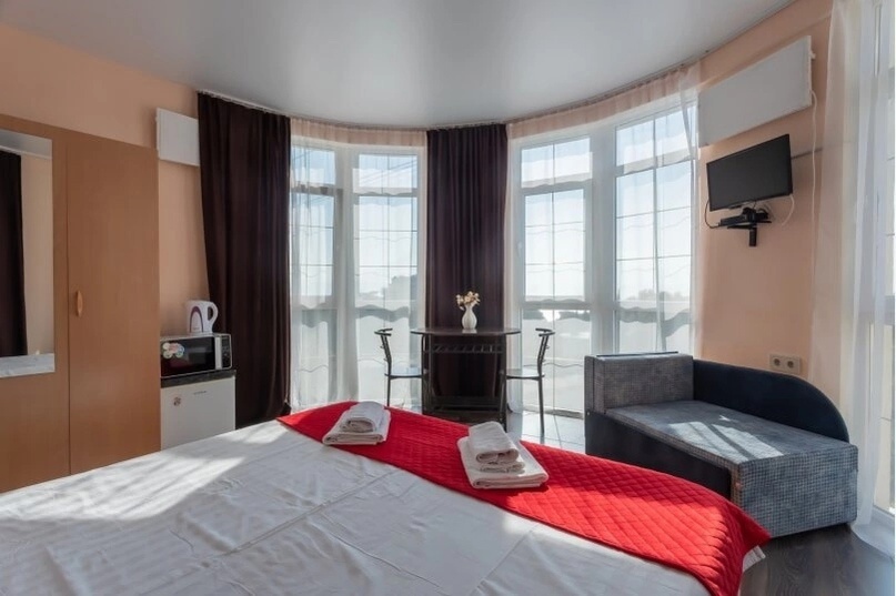 По кругу расположены 4 витражных окна в пол. В номере имеется 2 спальная кровать, односпальный диван, шкаф, стол, фен, кондиционер, телевизор со спутниковым ТВ, микроволновка, электроплита, холодильник, эл. чайник, мультиварка, набор посуды.