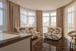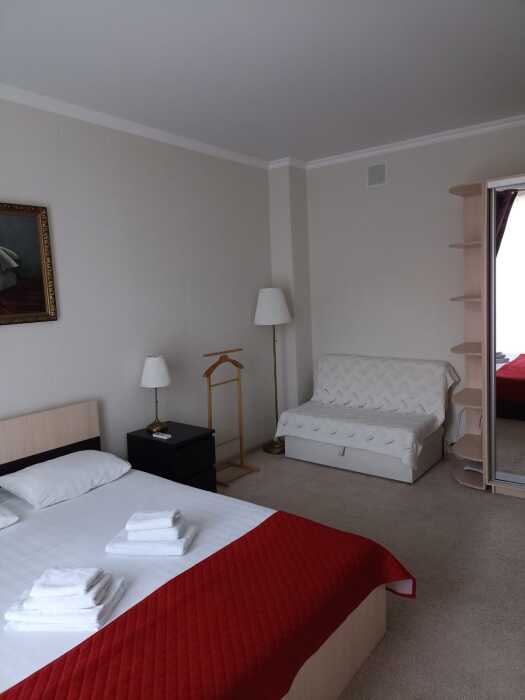 Люкс имеет полноценную кухню. Состоит из спальни и кухни-гостиной. Имеет 2 небольших балкона с боковым видом на море и город. Площадь номера 40-44кв/м. Номер также оборудован кондиционером, набором посуды, текстиля, полотенец, стиральной машиной. В номере телевизор со спутниковым ТВ, двуспальная кровать, двуспальный диван и односпальный диван.