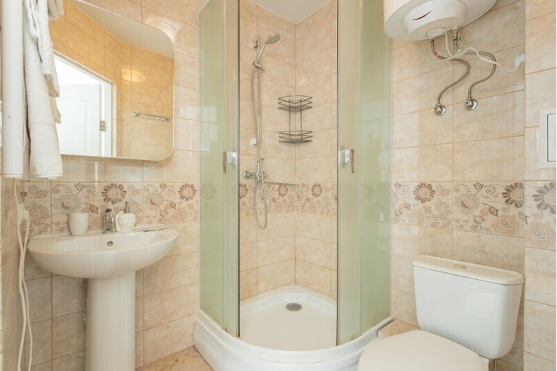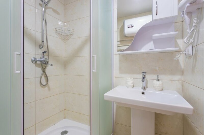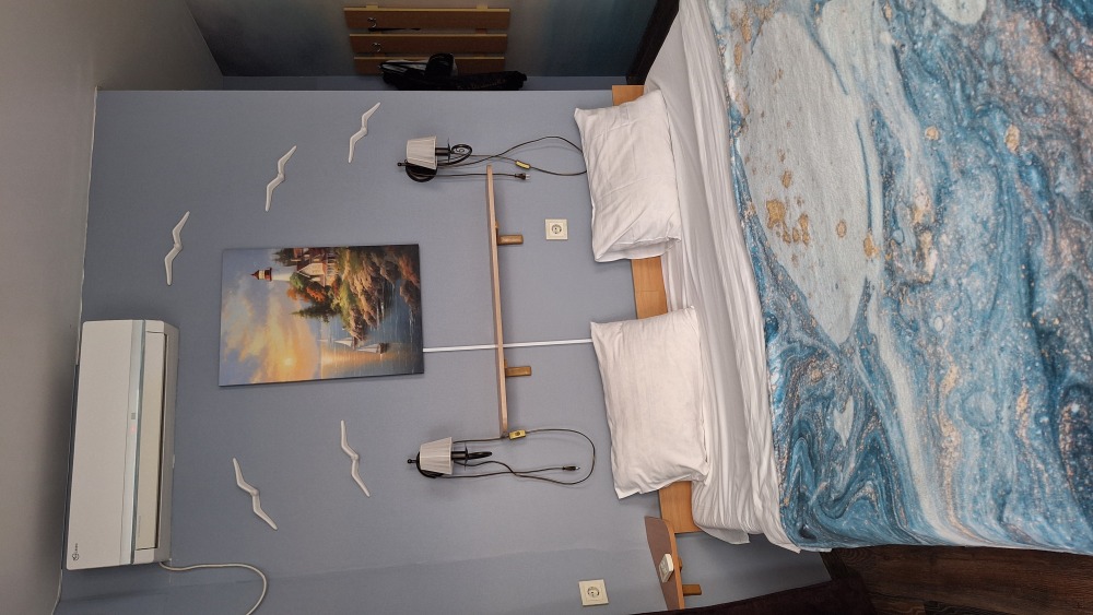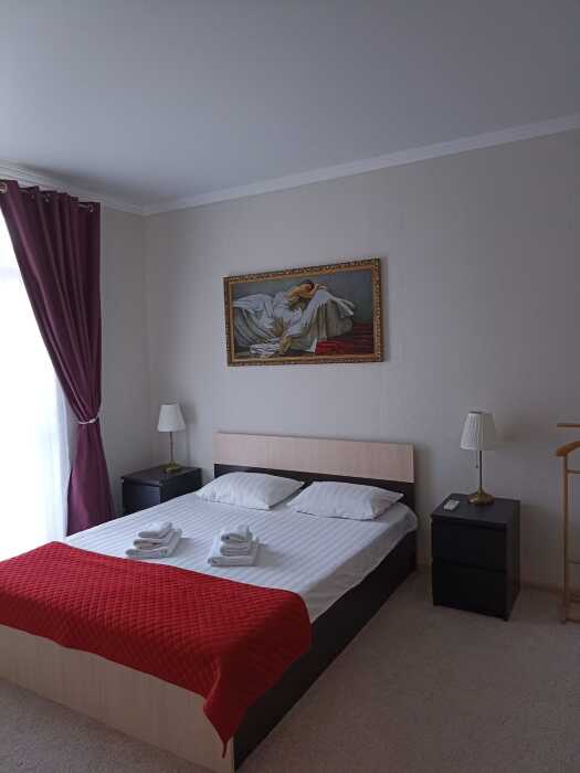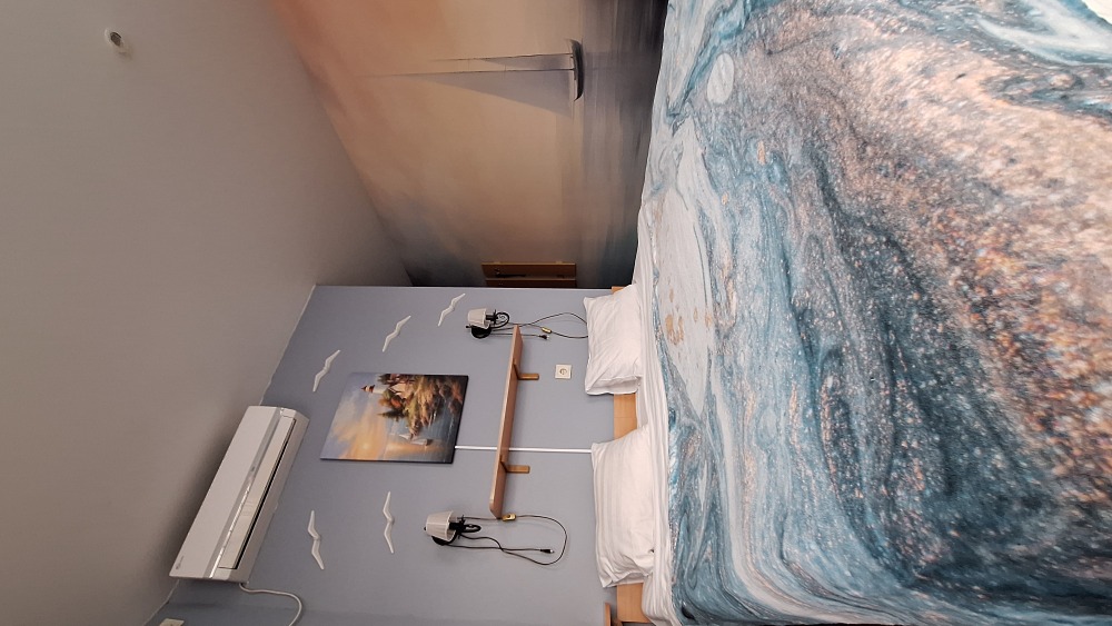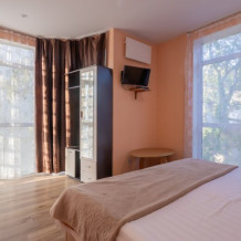 Номер рассчитан на размещение 1-2 гостей. Данный номера с 2 односпальными кроватями либо с одной большой двуспальной. Номер также оборудован кондиционером, бойлером набором посуды, кварцевыми обогревателями, мини кухней (холодильник, микроволновка, чайник, индукционная плита, набор для готовки).