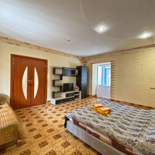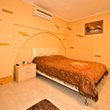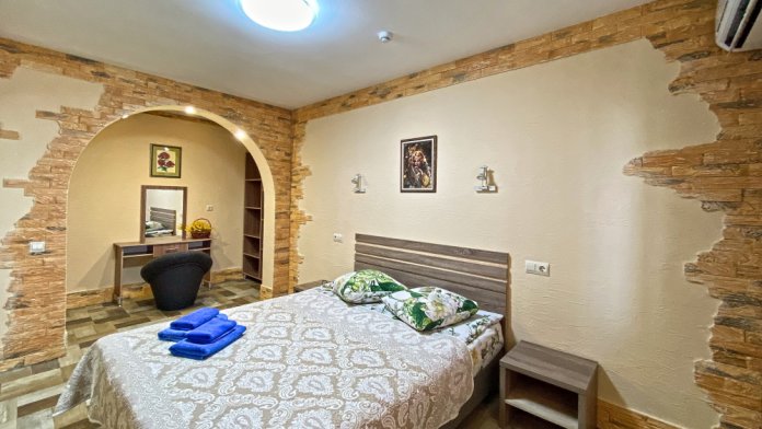 Один номер, расположен на 2 этаже. Площадь 55 кв.м., две комнаты, одна из комнат совмещена с кухней, балкон (столик, стулья). В номере двухспальная кровать, мягкий диван, односпальный раскладывающийся диван, все удобства в номере (душ, умывальник, туалет), горячая и холодная вода, гостиничный фен, стиральная машина, электроплита, чайник, посуда, микроволновка, холодильник, телевизор ЖК (2 шт.), DVD, кондиционер.
