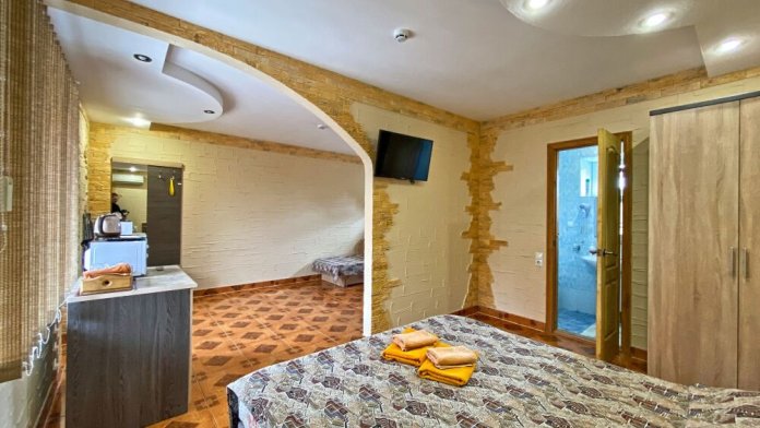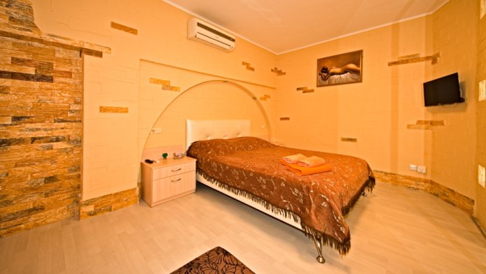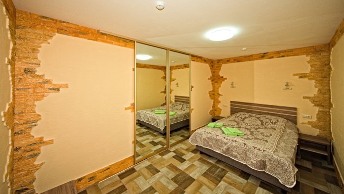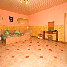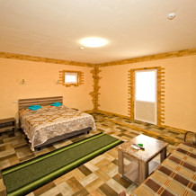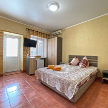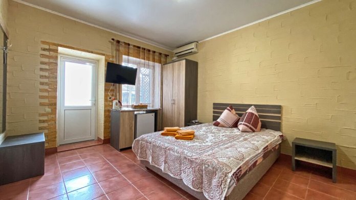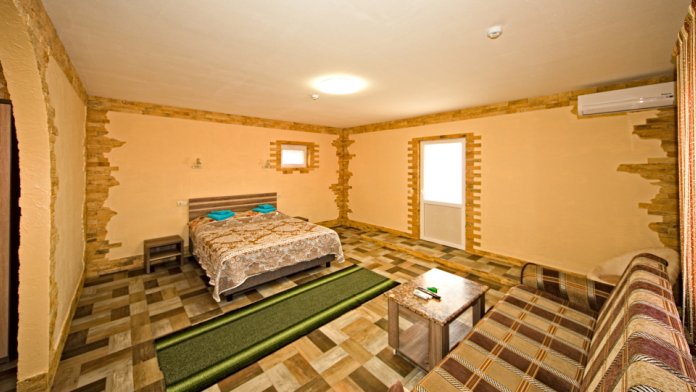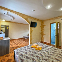 1 номер расположен на 1 этаже. Площадь 45 кв.м., одна спальня и комната-кухня. В номере две односпальные кровати и два раскладывающийся одноместный дивана, все удобства (душ, умывальник, туалет), горячая и холодная вода, гостиничный фен, электроплита, чайник, посуда, микроволновка, холодильник, два телевизора, кондиционер.