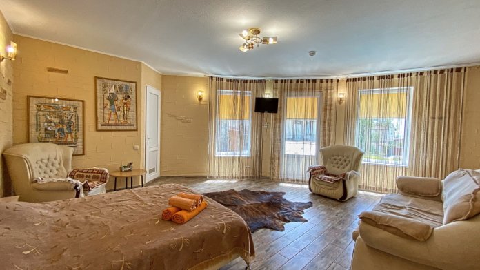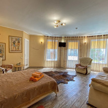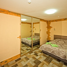 3 номера расположены на 1 этаже и 2 номера на 2 этаже. Площадь 35-45 кв.м. В номере одна разделенная на две жилые зоны комната. В номере двухспальная кровать, одноместная кровать и раскладывающийся одноместный диван при оплаченном 4-м спальном месте. Все удобства в номере (душ, умывальник, туалет), горячая и холодная вода, гостиничный фен, комплект столовой посуды, электрочайник, микроволновка, холодильник, телевизор (ЖК), кондиционер.