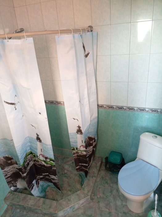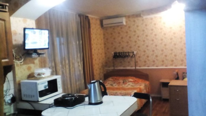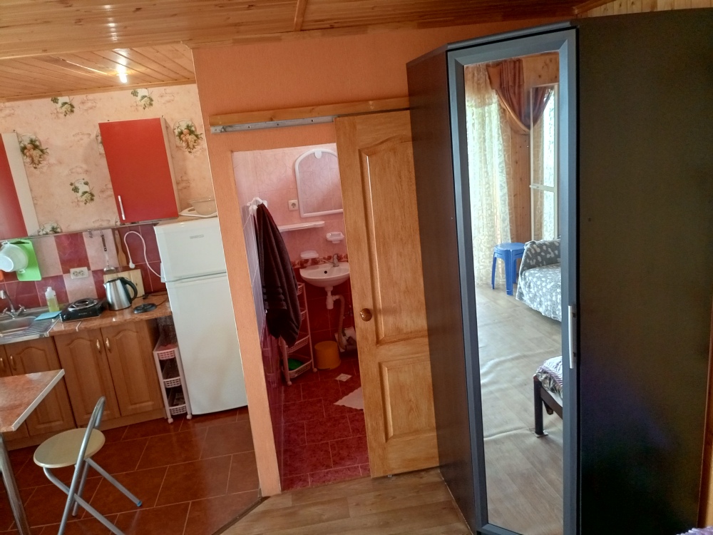 Просторный номер студия для комфортного проживания трёх человек,есть крытая летняя терраса 18 м2 на два номера,используется как зона отдыха , холодильник в номере,.