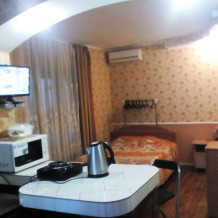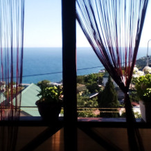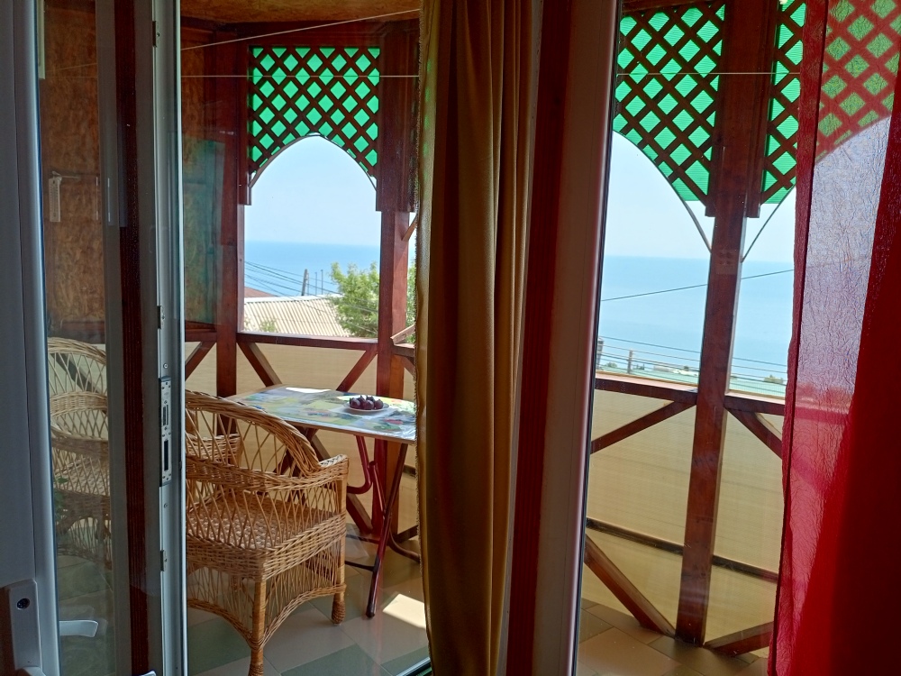 Замечательный вариант для семьи из четырёх человек. Просторный,солнечный,уютный номер студия с видовыми окнами,с летней террасой 12 м2,номер и летняя терраса обшиты деревом,вагонкой из сосны,что придаёт обстановке уют и комфорт. Цифровое телевидение. Фен предоставляется гостям при необходимости. Стиральная машинка за отдельную оплату. Есть возможность пользоваться микроволновой печью. На террасе есть мебель для отдыха,освещение,цветы и главное отличный вид на море!!!