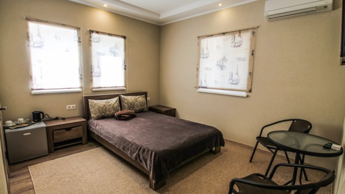 В номере: двухспальная кровать, дополнительное место- еврораскладушка на ламелях, кондиционер, телевизор с плоским экраном (81 см), wi-fi, горячая и холодная вода круглосуточно.